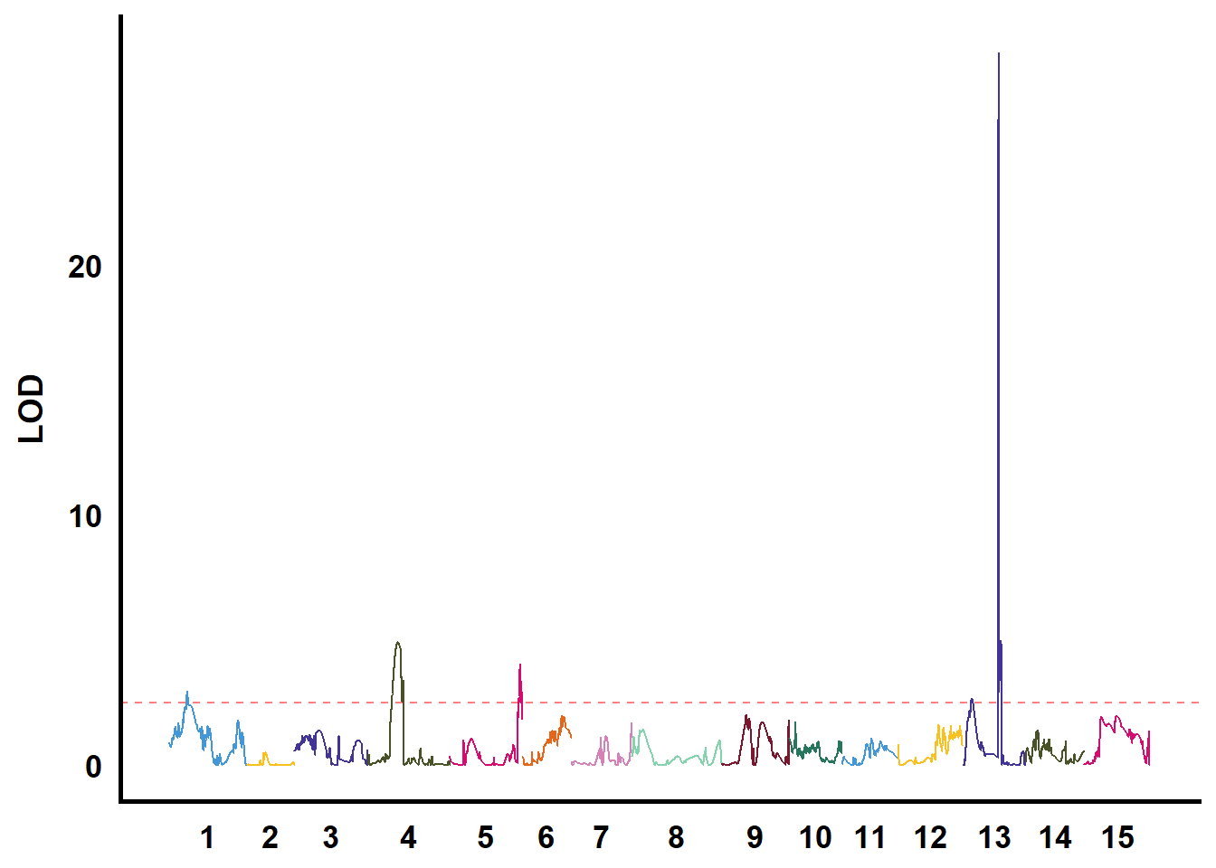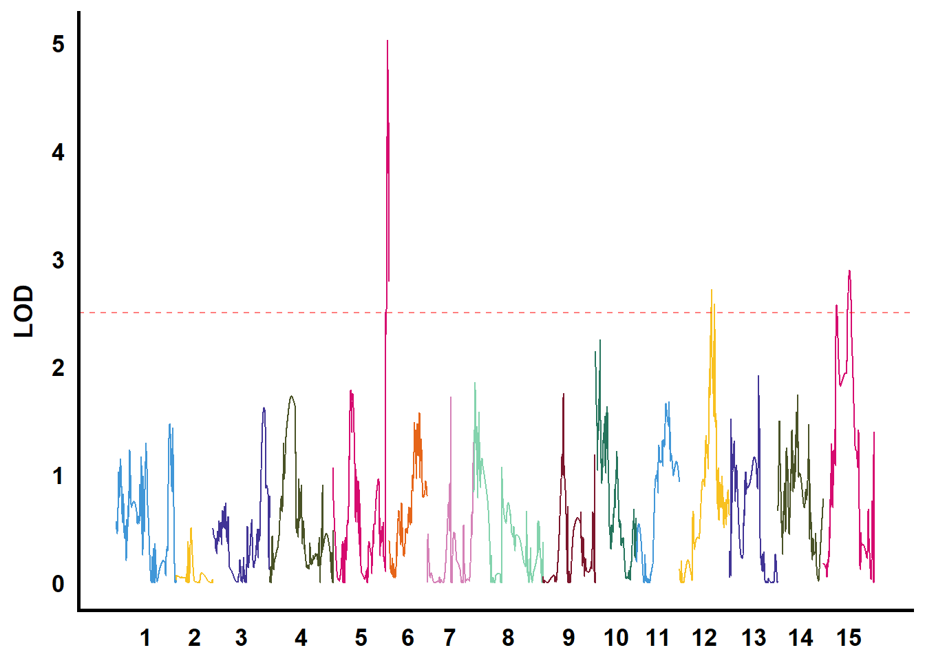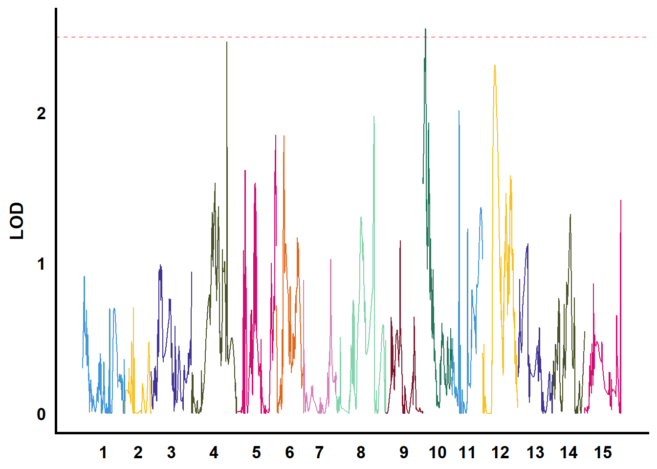 mapping = aes(x = pos, y = LOD, colour = as.factor(Chromosome))) +